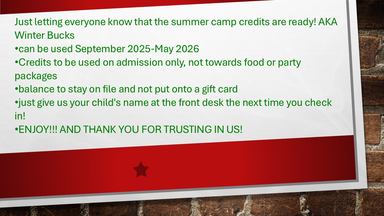 THANK YOU TO ALL OF OUR 84 AWESOME SUMMER CAMPERS!!Tickets on sale now!!!!ExploreWeekly SpecialsCafe MenuThe Facilities